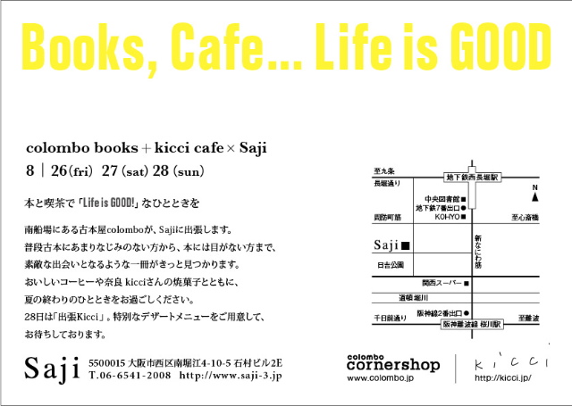 残暑もまだまだきびしいですが、秋の訪れも少しずつ、、。お盆が明けまわりのいろいろなお仕事の方も一斉に秋に向け動き出している感じです。さてコロンボでも読書の秋、芸術の秋をちょっと先取りして堀江のSajiさんで古本出張販売をします。ゆったりとした雰囲気の中での本探し、お楽しみください。